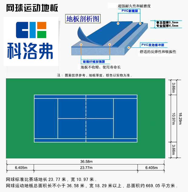 網球運動最早起源于英國。由于網球運動的激烈程度對地板的耐磨性有很高的要求,PVC塑膠運動地板具有良好的耐磨性及韌性,能夠很好的勝任運動員對地板的要求。同時PVC塑膠運動地板具有良好的防滑性,能夠是運動員的競技水平得到極大的提升,同時由于PVC塑膠運動地板的良好的減震性能夠很好的保護運動員的踝關節(jié)、膝關節(jié)等,是運動員在體驗運動樂趣的同時能夠很好的保護自己。 網球運動地板板材規(guī)格通覽: 單卷寬1.5m/1.8m 卷長20m(線內) 面層紋理:荔枝紋/寶石紋/沙地紋 總厚度:3.5mm/4.5mm/其他 顏色:天藍/草綠 場地線總長寬:23.77mX10.97m 地板總長寬:36.6mX18.3m 地板總面積:669.78㎡