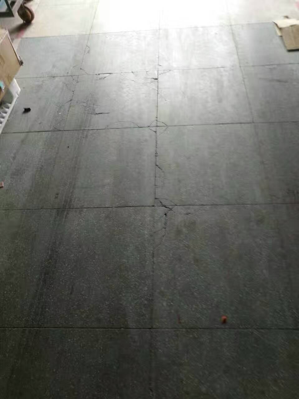 從圖上我們看到這個廠房的地面已經(jīng)開裂,并且嚴重影響美觀與日常工作需求了,從地面的損壞程度來看,這個地面應(yīng)該長時間受到重壓,地上有過車留下的刮痕,說明原地面在耐磨耐刮特性上欠缺,抗重壓重載方面欠缺。