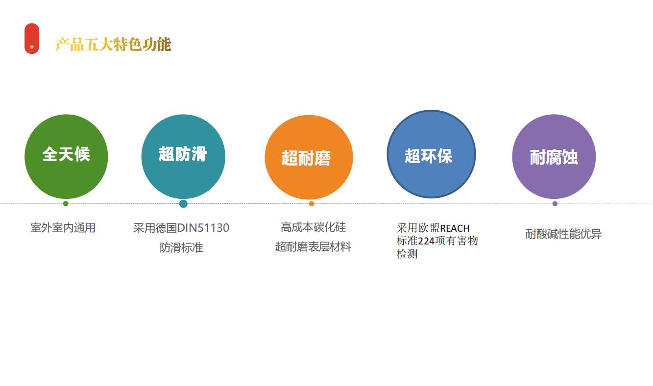 室內(nèi)室外通用,特殊抗老化成份及配方保證防滑地板在室外使用時的使用壽命